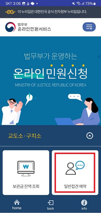 안내 페이지를 모두 닫은 후 일반접견(면회) 예약을 눌러주세요.