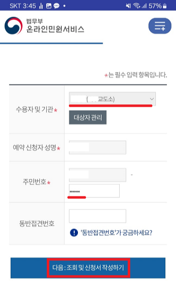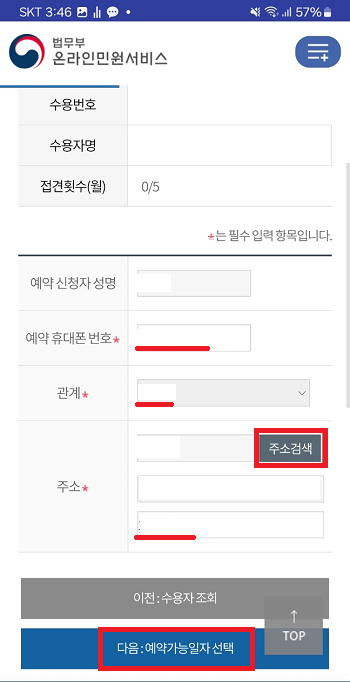 스크롤을 아래로 내려서 예약자 휴대폰 번호, 수감자와의 관계, 예약자 주소를 입력해주세요.