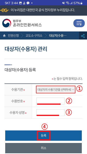 수용기관, 수용번호, 수용자 성명을 입력한 후 등록하기를 눌러주세요.