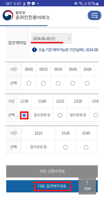 예약일, 시간대 클릭 후 다음:접견예약 완료를 눌러주시면 면회 신청이 끝납니다.
