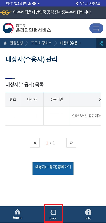 등록이 완료되었으면 이제 대상자(수용자) 목록에 대상자가 나타날 것입니다.