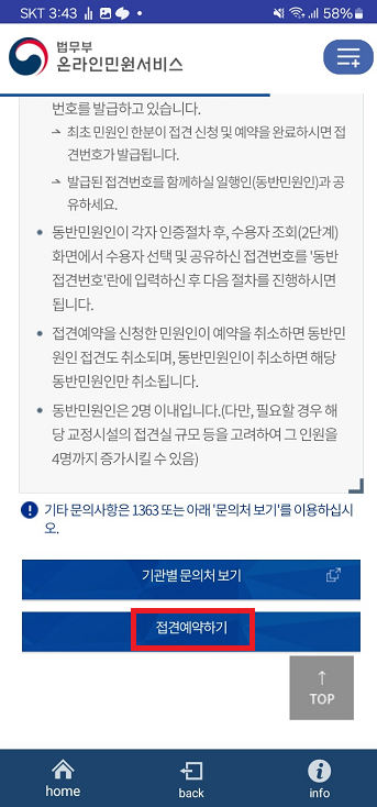 스크롤을 내려서 아래에 위치한 접견(면회) 예약하기를 눌러주세요.
