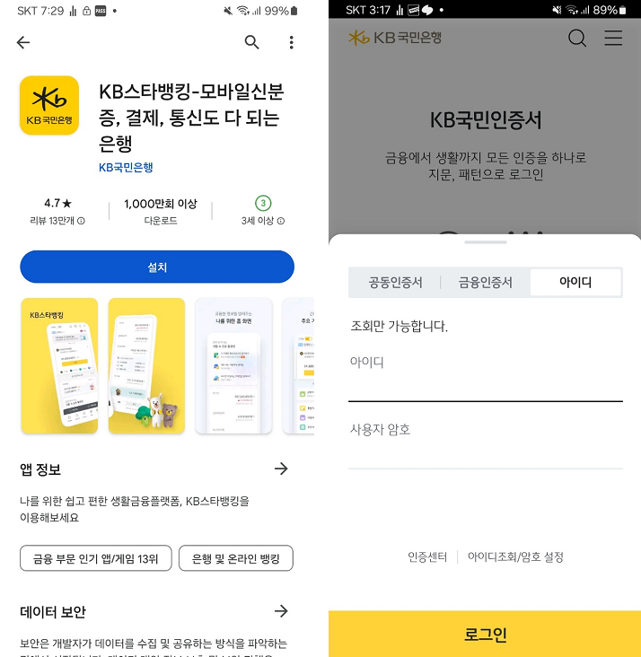 KB스타뱅킹 앱이 없으신 분들은 Play 스토어에서 검색 후 설치해주세요.