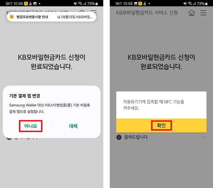 아니요, 확인을 누르면 KB모바일현금카드 신청 절차가 완료됩니다.