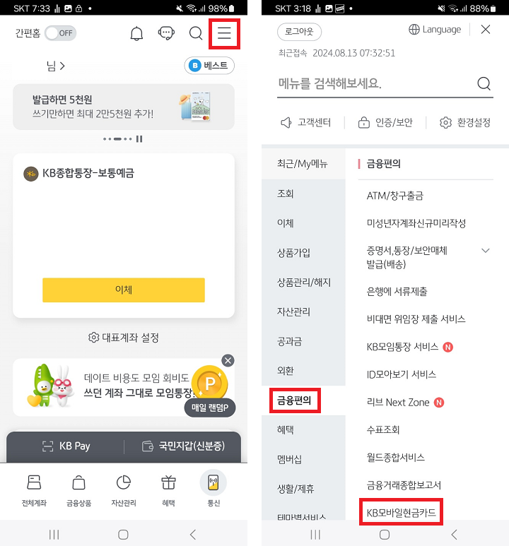 오른쪽 화면으로 넘어가면 왼쪽 아래의 금융편의를 선택하신 후 KB모바일현금카드를 눌러주세요.