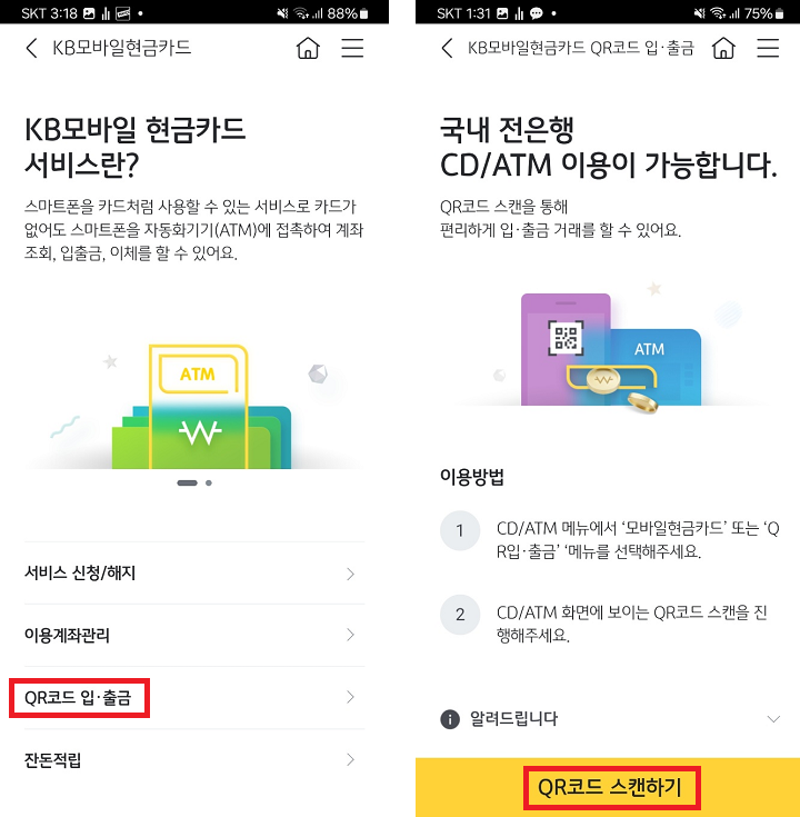 QR코드 입출금(모바일현금카드)를 눌러줍니다.