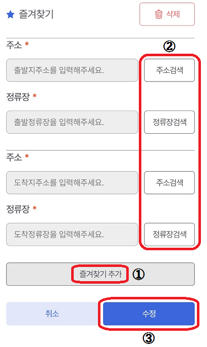 즐겨찾기 추가를 누르실 경우 출발지 주소, 출발 정류장, 도착지 주소, 도착 정류장 이렇게 4개의 칸이 한꺼번에 뜹니다. 이게 1세트이며, 총 3세트를 등록할 수 있습니다.