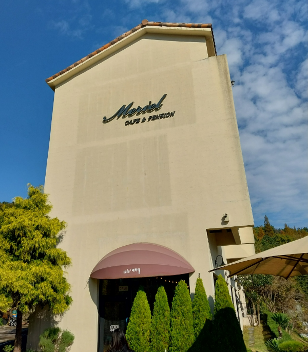 메리엘은 만성리 검은모래해변 입구의 반대 방향으로 계속 가면 나오는 가장 끝에 위치해 있습니다.