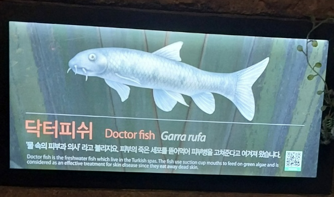 구멍난 곳에 손가락을 집어넣으면 닥터피쉬들이 몰려들어 피부의 죽은 세포를 뜯어 먹는데요.