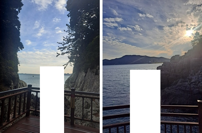 오동도 사진 스팟입니다. 왼쪽은 바람골, 오른쪽은 용굴입니다.