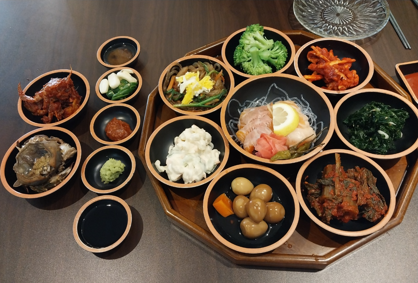 밑반찬은 잡채, 갓김치, 간장게장, 양념게장 등 가짓수가 무척 다양했습니다.
