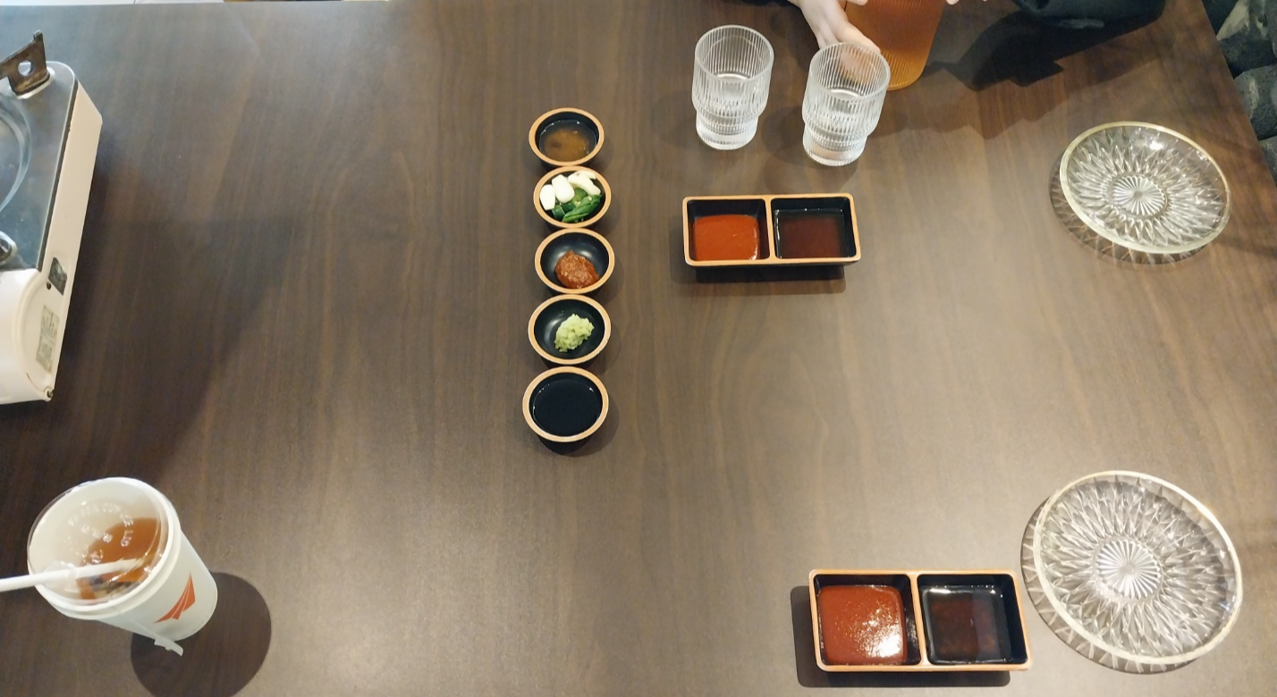 자리에 앉으면 소스와 물, 가스버너 등을 먼저 세팅해주십니다.