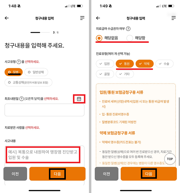 10. 사고유형 질병 선택 → 최초내원일 달력 눌러 선택 → 사고내용 예시를 참고하여 작성