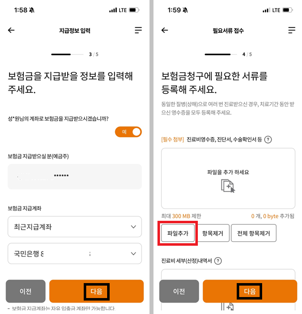 13. 보험금 지급받을 예금주, 지급계좌 확인 후 다음