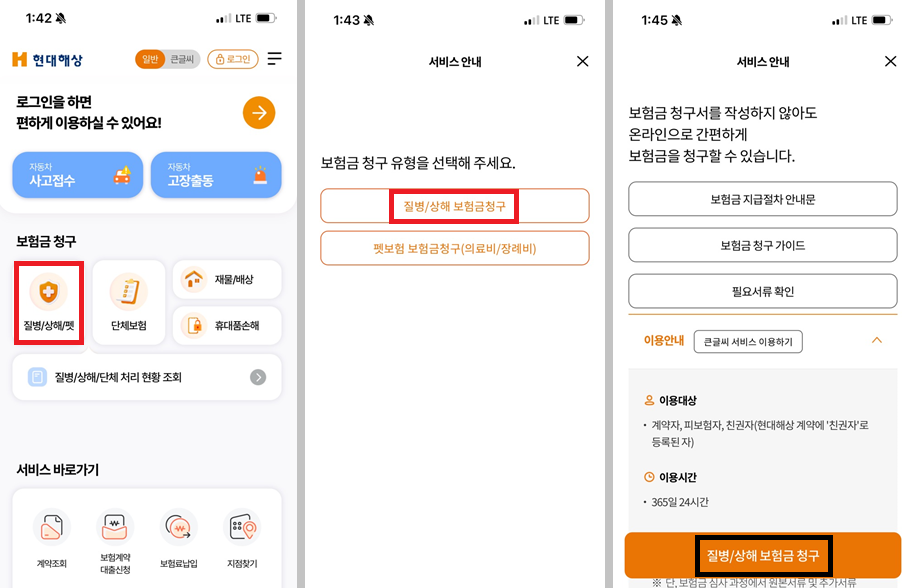 1. 현대해상 앱 메인 화면에서 질병/상해/펫 선택