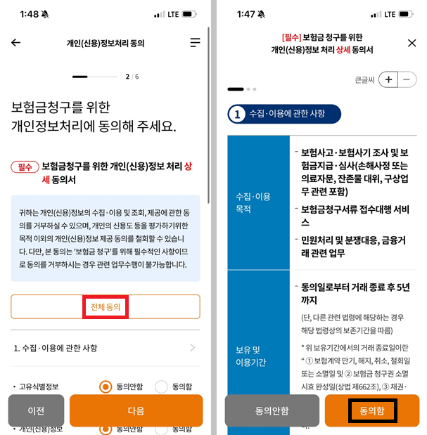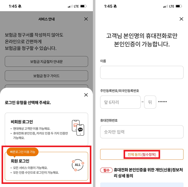 비회원으로 로그인 시 보험금 청구할 때마다 본인인증을 해야 합니다.