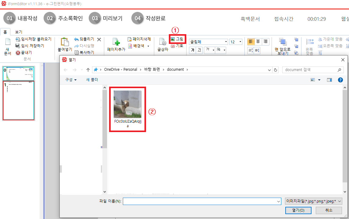 만약 서신에 사진이나 그림을 첨부하고 싶다면 1번 그림을 클릭하시면 됩니다.