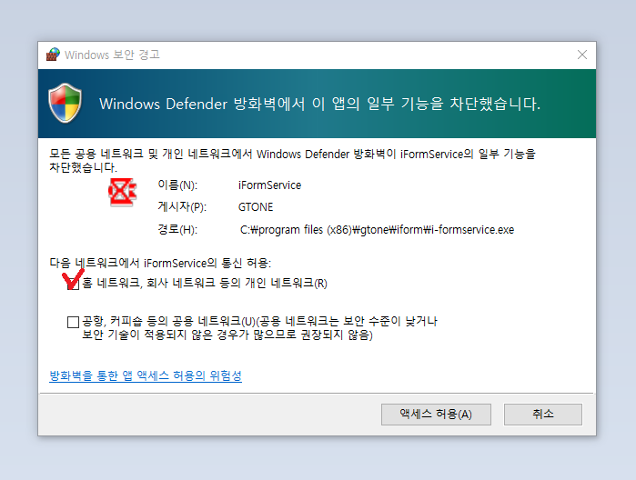혹시나 이런 창이 뜬다면 홈 네트워크 옆 네모 박스에 체크하신 후 아래쪽의 액세스 허용을 누르시면 됩니다. 여기까지가 e-그린우편을 사용하기 위한 준비이고, 본격적으로 교도소, 구치소에 인터넷 편지 보내는 법을 아래에서 소개하겠습니다.
