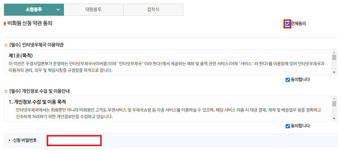 비회원 신청하기 버튼을 누르면 다음과 같은 창이 뜨는데 오른쪽 위의 전체동의 옆 네모 박스를 클릭해주시면 됩니다.