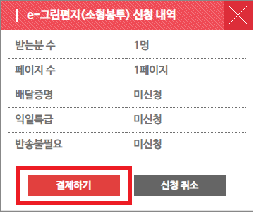 위와 같은 창이 뜨면 배달증명, 익일특급 여부, 반송불필요 여부 등을 확인 후 결제하기를 눌러주시면 됩니다.