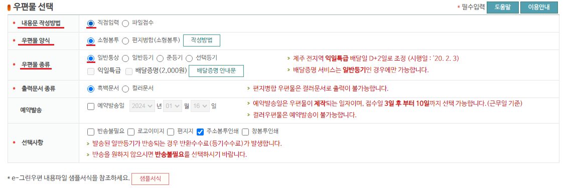선택등기(보통과 특급으로 구분, 2회 이상 배달 후 수취인이 없을 경우 우편함에 투함, 반송X): 일반등기와 가격 동일