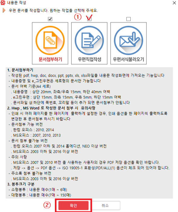 작성된 파일을 불러오는 방식이 아니라 직접 타자로 쳐서 편지를 작성할 거라면 위와 같이 우편직접작성 위의 네모를 클릭한 후 확인을 클릭하시면 됩니다.