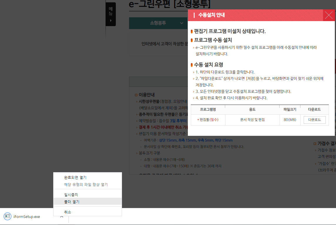 그린우편 서비스를 사용하기 위해 필요한 프로그램을 설치하는 방법입니다.