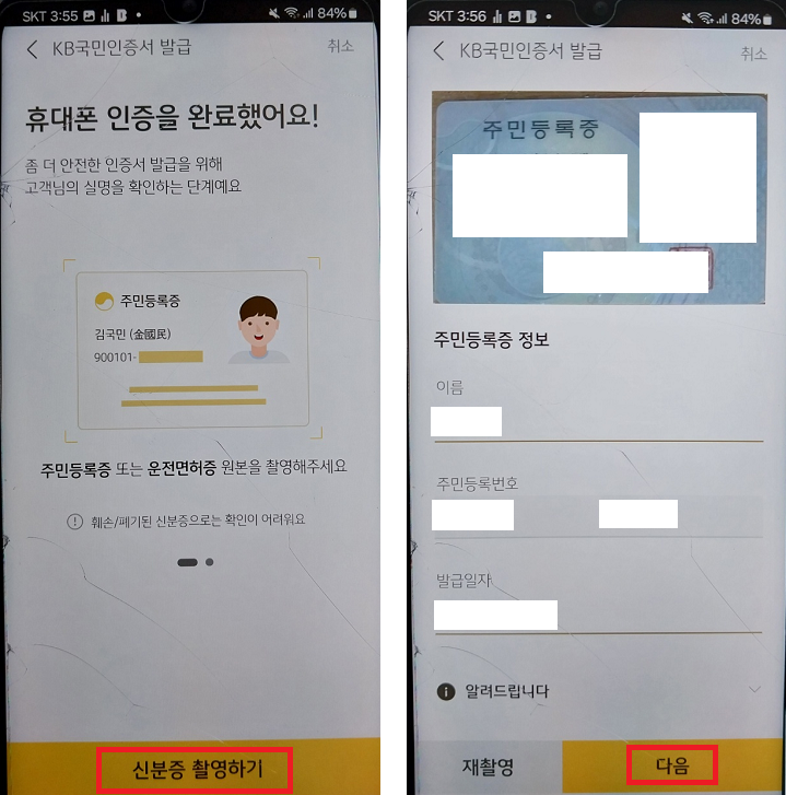 일치하는지 확인하시고 일치하지 않으면 재촬영, 일치한다면 다음을 눌러주세요.