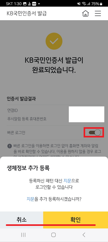 나중에 KB스타뱅킹 앱을 이용할 때 자동으로 KB국민인증서로 로그인이 됩니다.